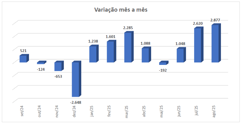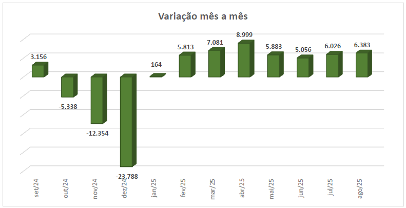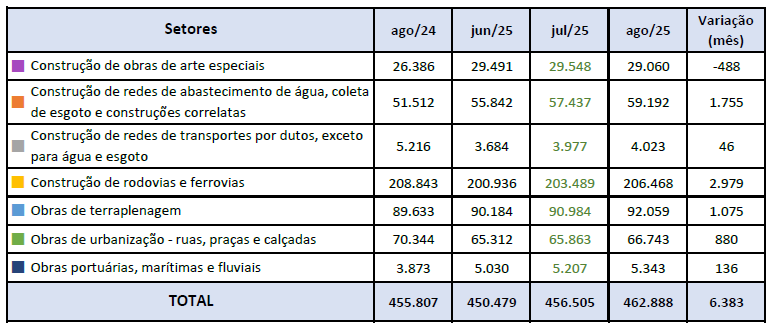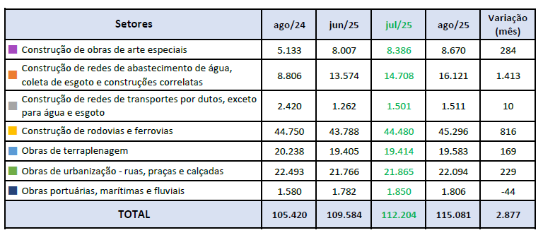 A única queda verificada foi no setor de “Obras Portuárias, Marítimas e Fluviais” que dispensou 44 trabalhadores no mês de agosto de 2025. Em todo o estado de São Paulo, o setor da construção pesada empregou, no mês de agosto, 115.081 operários.