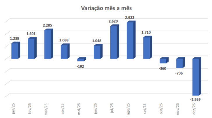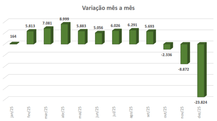 Em segundo lugar, ficou o setor de “obras de terraplenagem”, com o fechamento de 557 ocupações. Nenhum dos demais setores que compõe o nível de emprego apresentou resultado positivo em dezembro de 2025. Os dados são do Ministério do Trabalho e Emprego – CAGED. Comparativamente com o mês anterior, novembro, os números do último mês de 2025 representaram um volume quatro vezes maior na quantidade de vagas perdidas. Em novembro, foram registradas 736 dispensas.
