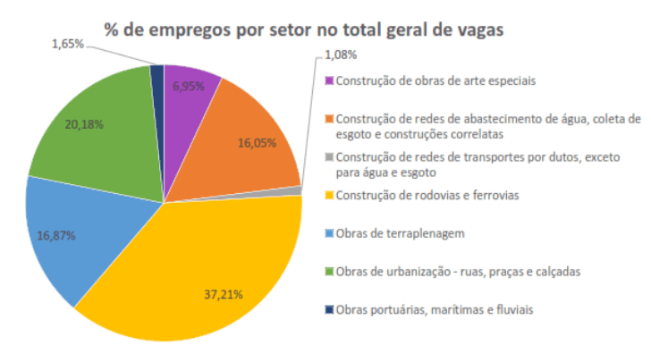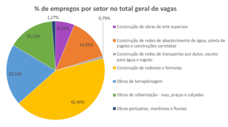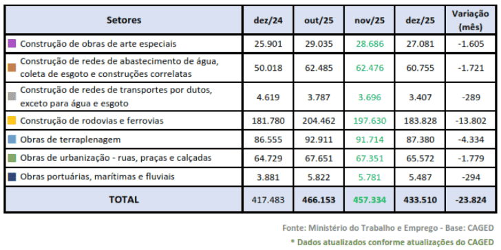 Em nível nacional, o percentual de vagas ainda ocupadas no setor de “construção de Rodovias e Ferrovias” (42,4%) superou, em dezembro, todos os demais segmentos que compõe o nível de emprego. Em segundo lugar ficou o segmento ”obras de terraplenagem” com 20,16% do total de vagas. Em todo o país, o total de trabalhadores ativos no mês de dezembro de 2025 foi de 433.510. .